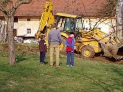 Het stukje land dat naast de minicamping ligt was al jaren niets meer aangedaan, dus dat had wel enige bewerking nodig, dus toen ik de shovel langs hoorde komen ben ik naar de weg gerent om te vragen wanneer hij tijd had om langs te komen, maar deze man parkeerde gelijk zijn machine in de tuin zodat de drie opzichters wat te bekijken hadden.