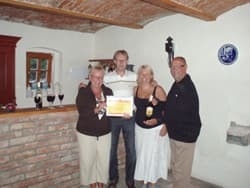 Een maand geleden werd er in de nacht op de deur geklopt, dus ik met mijn knuppel naar beneden, ze zeiden in het engels dat ze ons wilde ontmoeten, ik heb toen gezegd dat ze maar op een normale tijd langs moesten komen, maar deze twee aangeschoten mannen hoepelde niet op, dus heb toen uit eindelijk maar de deur open gedaan, Susan had inmiddels ook onze buurman gebeld en samen hebben we ze toen naar huis kunnen kletsen. Een van deze twee mannen was een Engelsman die met een vrouw uit het dorp is getrouwd en hier een jaar woont, en in de plaatselijke kroeg had de andere man hem zo gek gekregen om met ons even te gaan kennis maken. Bij dezen ontmoeting had deze Engelsman zijn sigaretten laten liggen, die ben ik later bij zijn vrouw wezen afgeven, die schrok zich rot van het verhaal, van wat haar man had gedaan, en heeft wel honderd keer sorry gezegd, Ik heb ze toen uitgenodigd voor een kopje koffie, wat dus wel een leuke kennismaking werd. De Engelsman vertelde dat hij hier in Tsjechië golf speelt, en vroeg of ik een keer mee wilde, dat is inmiddels gebeurt, en onze Dennis mocht ook mee, dus hij moest ook netjes in de kleding, Dennis en ik hebben heel wat ballen de lucht in geslagen, ook Dennis ging het steeds beter ging doen, later gingen we met nog een andere golfer een wedstrijdje doen, en de winnaar was Dennis.