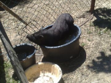 Tropische themperaturen bij ons, dat we allemaal een koel plekje zoeken en zelfs ons varkentje zat in een waterton om zijn dikke buikje te koelen.