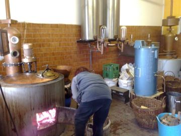 De pruimen oost van 2009 was goed en heeft een paar maanden in een ton gezeten. Ik had een stokerij besproken 20 km bij ons vandaan, maar de buurman kwam met een nieuw adres een paar km bij ons huis vandaan, waar op traditionele wijze in een hout gestookte ketel de slivovice werd gestookt. Die nu in onze eigen flessen zitten
